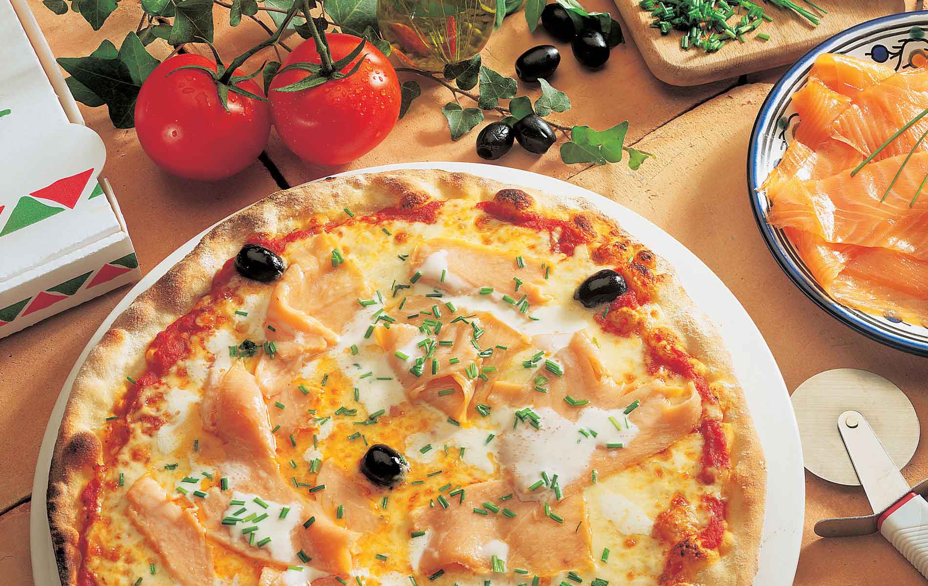 Sauce tomate, saumon fumé, ciboulette, crème fraîche, olives, fromage