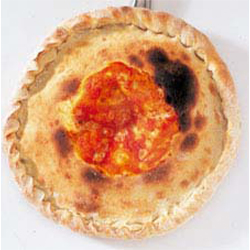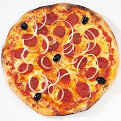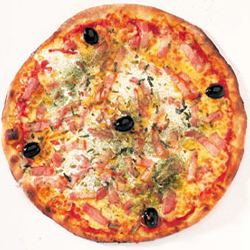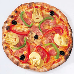 Sauce tomate, jambon, cœur d’artichaut, champignons de Paris, poivrons verts et rouges, olives, fromage.